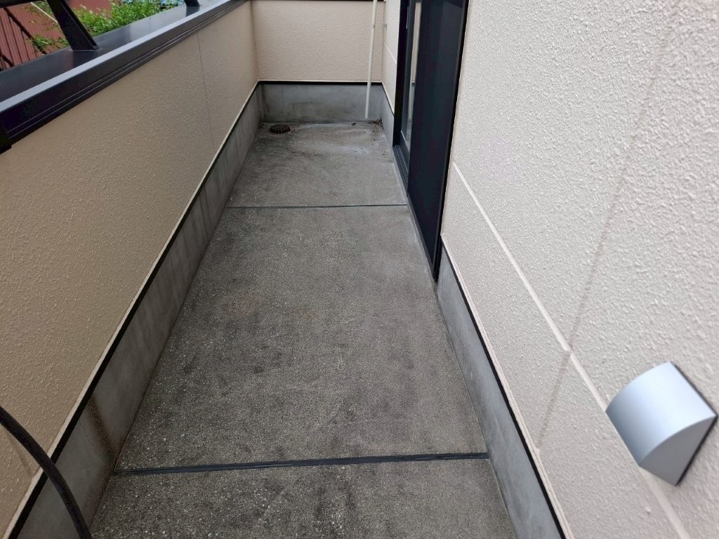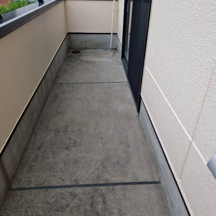 まず高圧洗浄でベランダ床面の汚れ・カビ・旧塗膜を徹底除去。