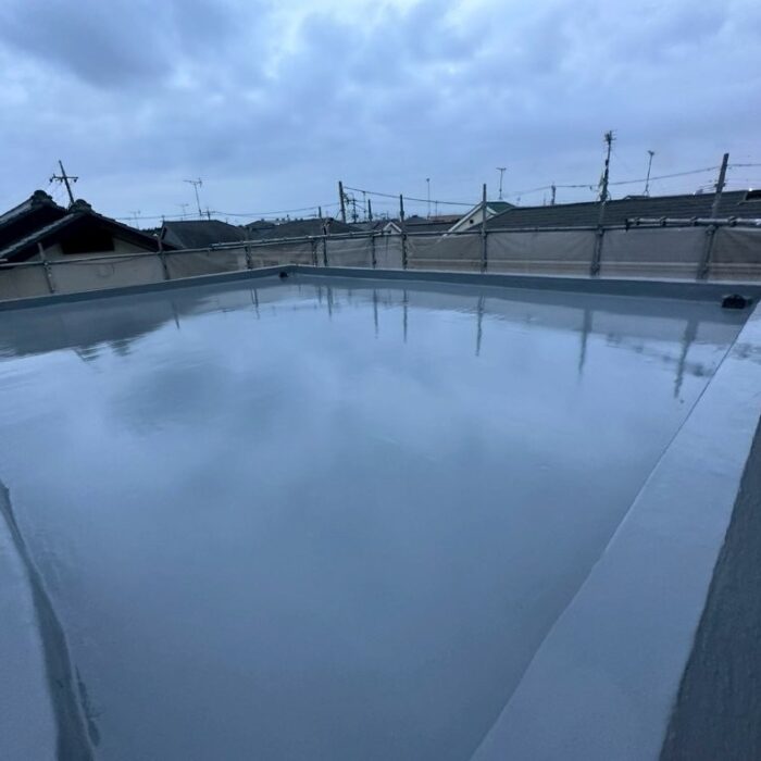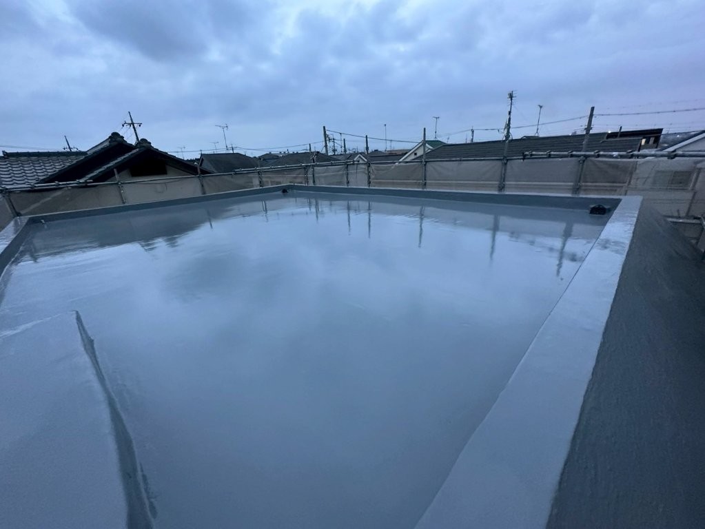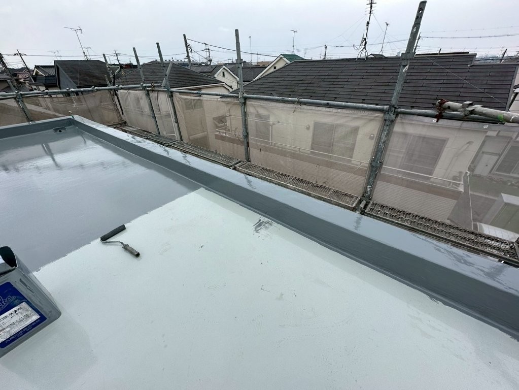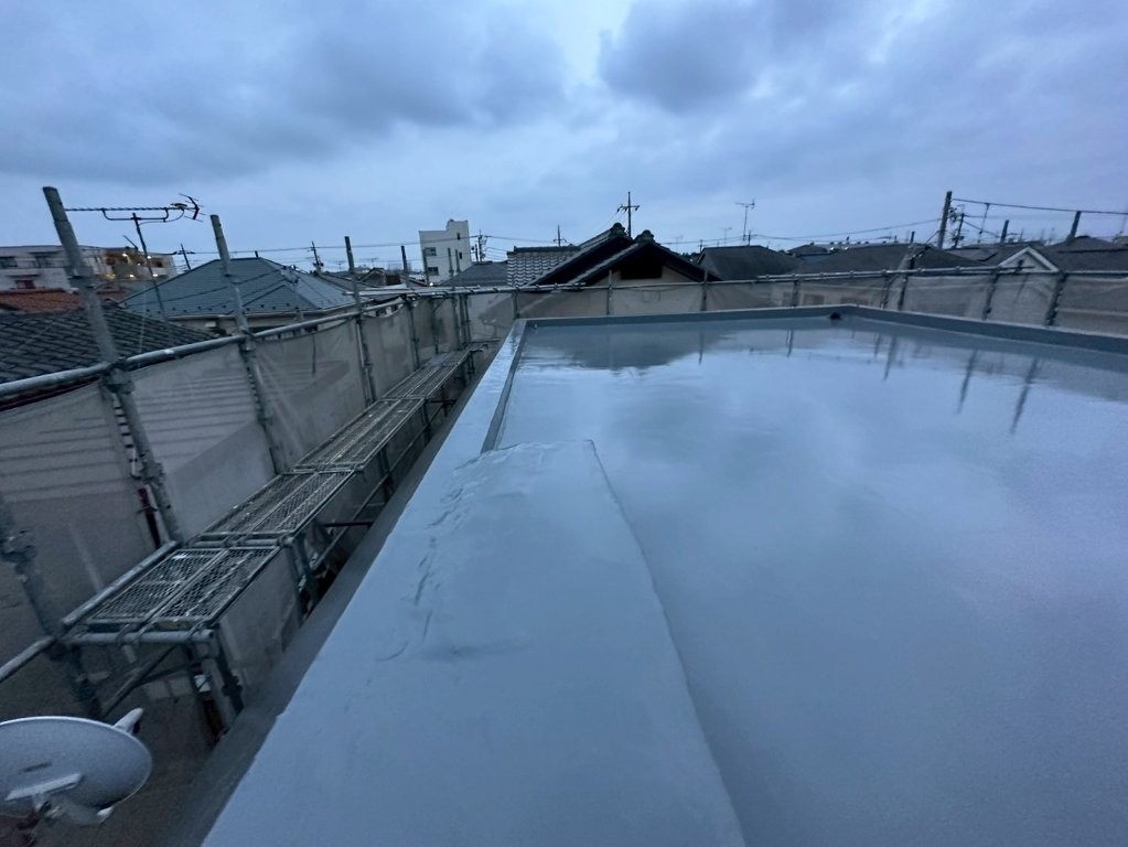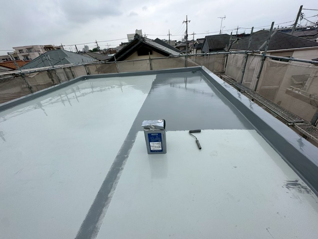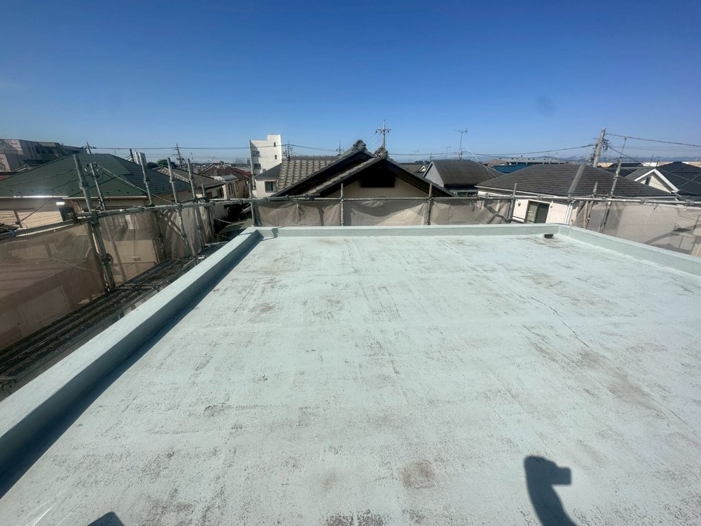 今回の川越市の施工では、ウレタン2層+トップコートの標準仕様を徹底 し、建物を長期にわたり守る防水層を再構築しました。