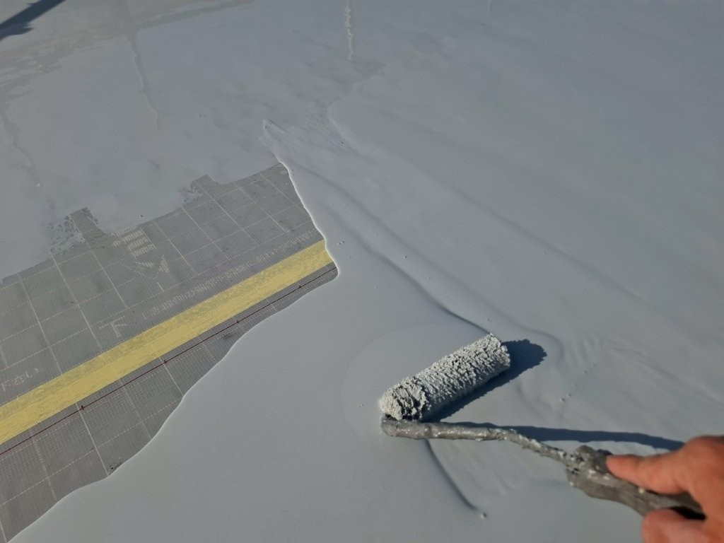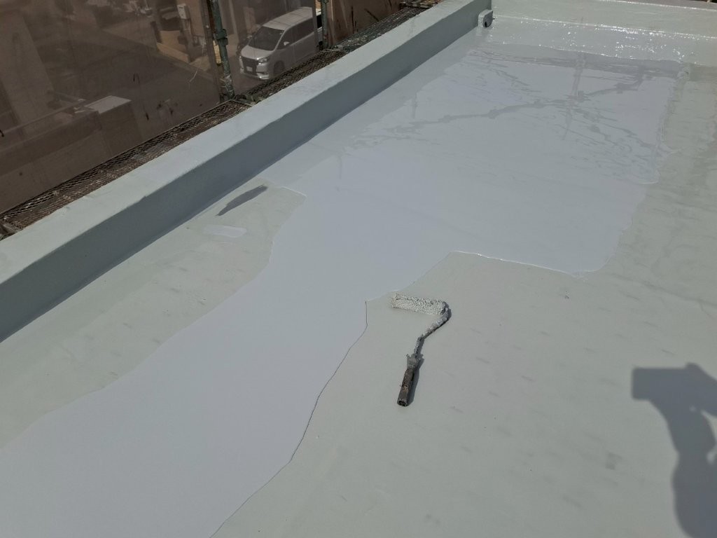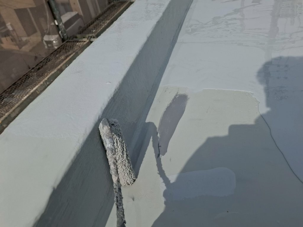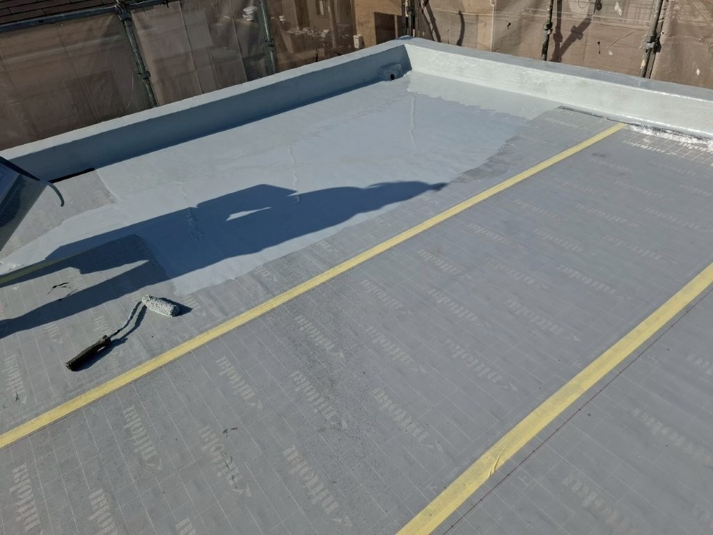 シート目地が見えなくなるまで十分な膜厚を確保しつつ、立ち上がりや角部はローラーで丁寧に押さえ、さらにドレンまわりは特に入念に塗り込むことで、均一で信頼性の高い防水層を形成しました。