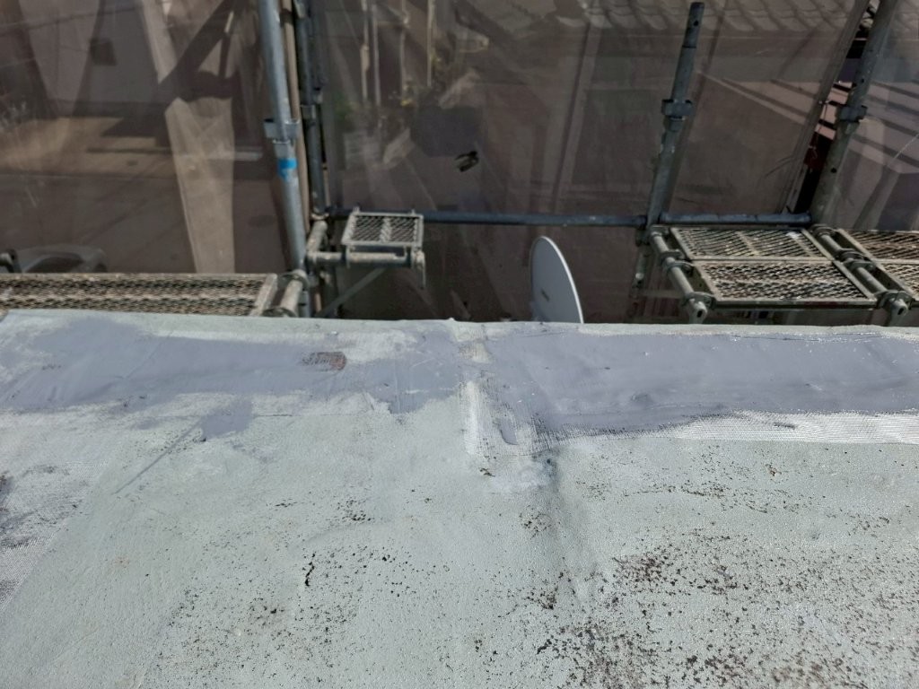 不陸(段差)を部分補修し、後の通気シート施工とウレタン塗布が均一になるよう下地を整えました。