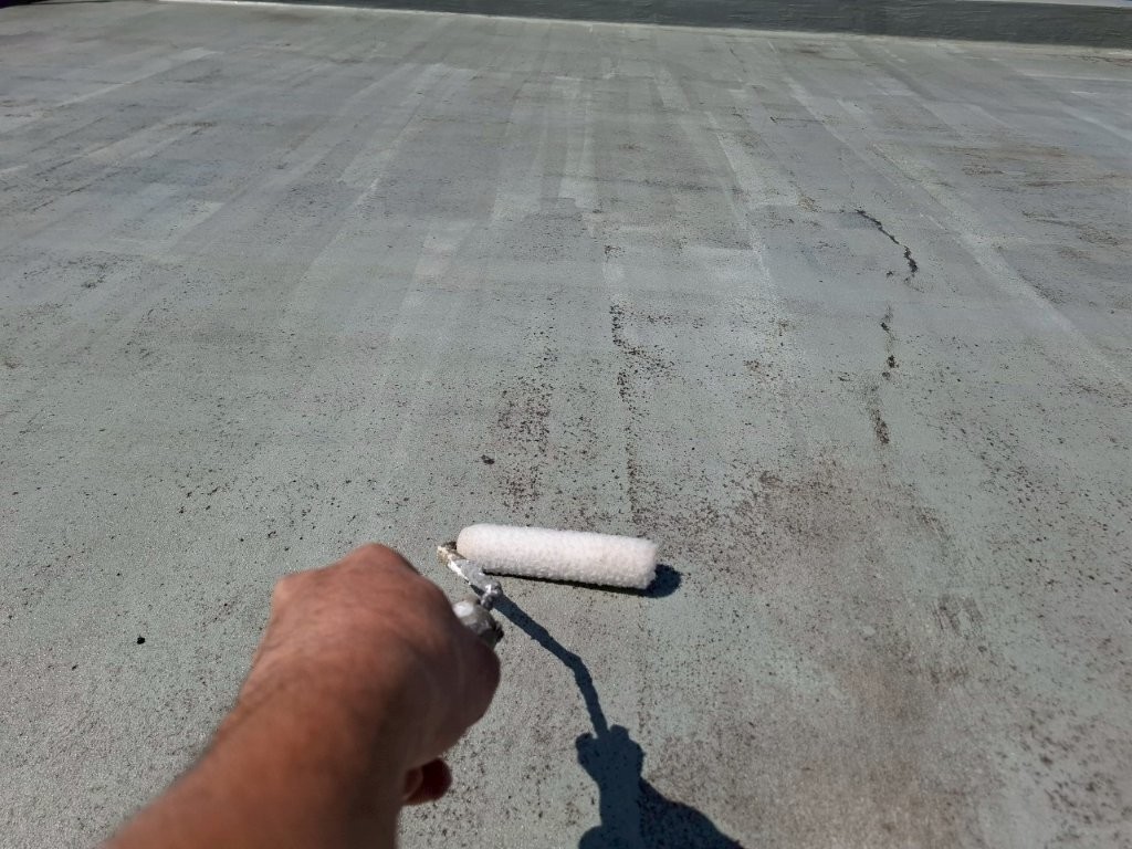 下地乾燥を確認し、ウレタン防水用プライマーをローラーで均一に塗布。