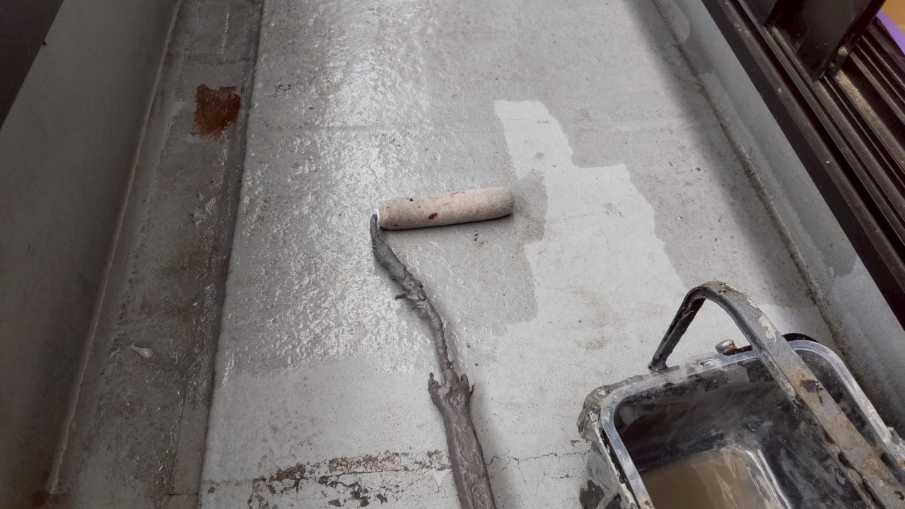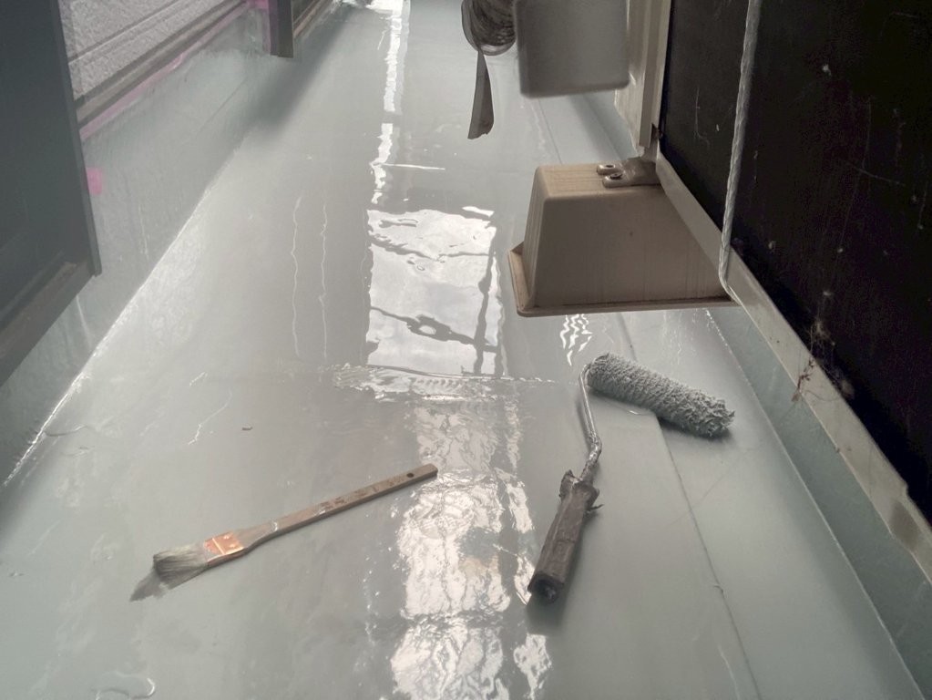 そのため、刷毛とローラーを適切に使い分けながら、塗り残しや塗布量の偏りが出ないよう細部まで丁寧に作業を行い、既存下地とウレタン防水材がしっかりと密着する状態を確保しました。