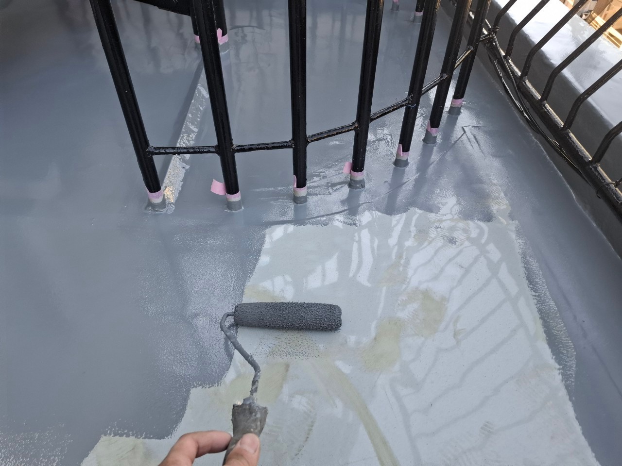手すり支柱の根元や立ち上がり部など、雨水が集中しやすい箇所は特に丁寧に施工します。