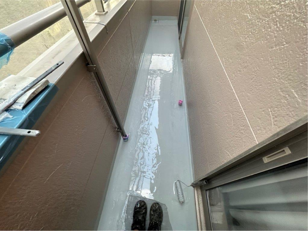狭小ベランダでは塗り継ぎが出やすいため、塗布の均一性を意識して施工します。