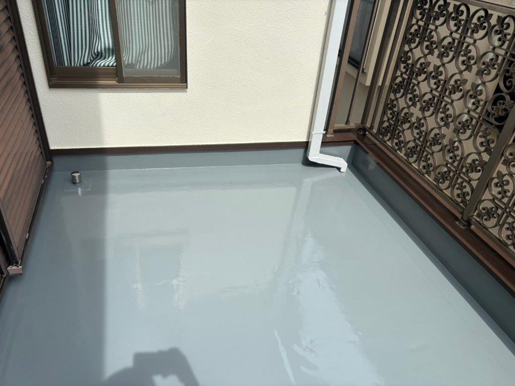 施工後は、床面全体が均一に仕上がり、立上りや排水まわりまで連続した防水層が確保された状態となりました。東京都杉並区のように日射や降雨の影響を受ける戸建てルーフバルコニーでは、こうした改修を適切な時期に行うことが、将来の漏水予防につながります。