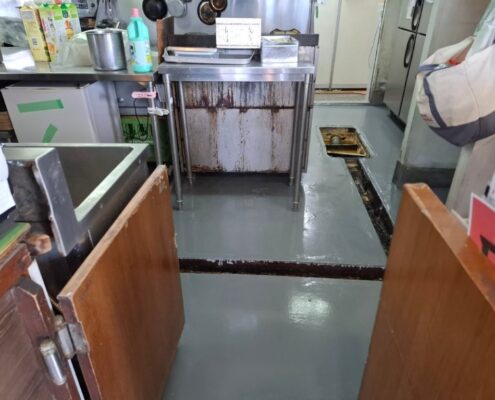 【神奈川県藤沢市】飲食店 厨房ウレタン防水工事|油・水・洗剤に強い防水床で漏水リスクを根本対策